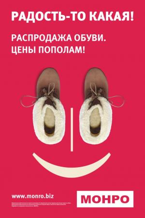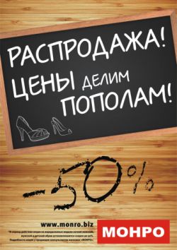 С 14 сентября 2012г. по 11 октября 2012г. в магазинах федеральной обувной сети «Монро» объявляются беспрецедентные скидки до 50% на туфли и осеннюю обувь*!
