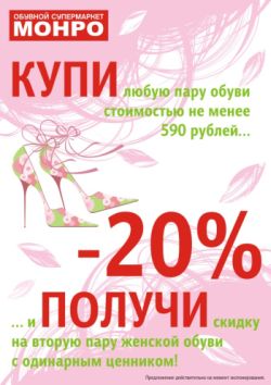 С 25.02.2012 по 19.03.2012 в обувных супермаркетах «Монро» в городах: Ростов-на-Дону и Шахты женские туфли весенней коллекции по 590 руб., мужские туфли весенней коллекции - по 690 руб.!