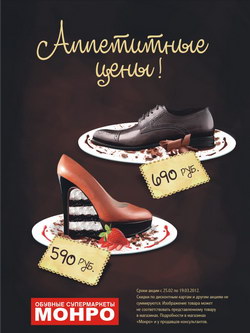С 25.02.2012 по 15.03.2012 в обувных супермаркетах «Монро» в городах Подмосковья женские туфли весенней коллекции по 590 руб., мужские туфли весенней коллекции - по 690 руб.!