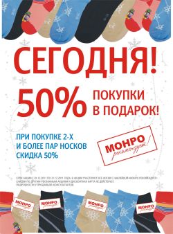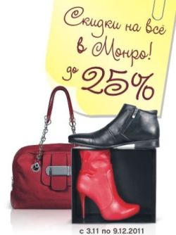 С 6 декабря 2011г по 14 февраля 2012г в обувных супермаркетах МОНРО акция - скидки на обувь до 50%. Скидки на сумки и кожгалантерею до 33%, а также действуют акции в отделе колгот и белья.