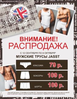 В период С 12 сентября по 9 октября у всех желающих будет возможность купить мужские трусы JASST по сниженным ценам. Классические трусы по цене 79 рублей, боксеры и/или шорты по цене 109 рублей.