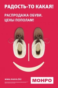 С 5 декабря во всех магазинах обуви «Монро» действуют скидки до 50% на зимнюю коллекцию женской, мужской и детской обуви, а также на сумки и чулочные изделия*!