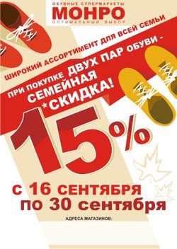 С 16 по 30 сентября при покупке двух пар обуви в обувных супермаркетах Монро предоставляется семейная скидка 15%. Монро - это широчайший выбор обуви для всей семьи - приглашаем за покупаками!!!
