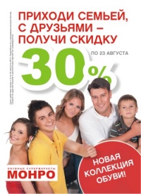 Лето - это сезон хорошего настроения и горячих скидок! В сети обувных супермаркетов МОНРО уже началась традиционная летняя распродажа! На этот раз обувь можно купить с потрясающей скидкой в 50% ! Так же всех покупателей ждут скидки на сумки и всю кожгалантерею до 33% !