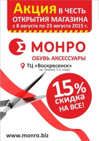 В период с 8 по 23 августа 2015 года (включительно) покупателей ждет скидка в размере 15%* на все товары с белым одинарным ценником. Вас ждут демократичные цены, стабильное качество, большой ассортимент товаров, полюбившихся брендов! Приходите всей семьей - ведь у нас вы найдете стильную женскую, яркую детскую и практичную мужскую обувь и аксессуары. Спешите порадовать себя и своих близких приятными покупками! Ждем Вас по адресу ТЦ «Воскресенск» пр. Ленина, 5 (2-ой этаж). Приходите!