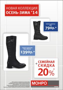До 19 февраля 2014г. во всех магазинах обувной сети «Монро» скидка 50% на зимнюю коллекцию обуви*! Со скидкой Вы можете приобрести женскую, мужскую и детскую обувь. В дополнение к Вашей идеальной паре - широчайший выбор обуви и аксессуаров для всей семьи!