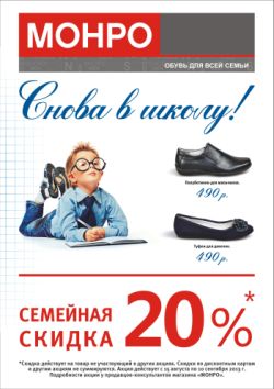 С 15 августа по 10 сентября 2013г. в обувной сети «Монро» можно выгодно приобрести обувь для всех членов семьи. Для этого достаточно принять участие в акции «Семейная скидка 20%». Мама, папа и дети – никто не уйдет из «Монро» без обновки.