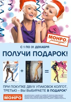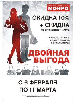 С 6 декабря 2011г по 14 февраля 2012г в обувных супермаркетах МОНРО акция - скидки на обувь до 50%. Скидки на сумки и кожгалантерею до 33%, а также действуют акции в отделе колгот и белья.